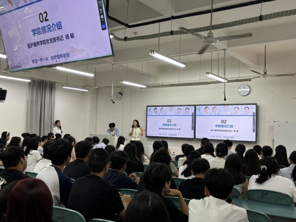 随后,医护康养学院党支部书记杨敏详细介绍了学院的整体情况,包括师资力量、教学设施、师资配备、学习资源和规划等,让新生们对学院有了更全面的了解。
