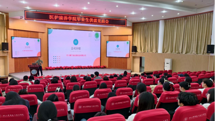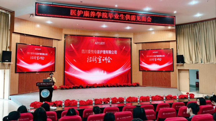 在企业宣讲环节,四川爱悦母婴护理有限公司、成都正禾家政服务中心、四川馨予康连锁药房有限公司相关人事负责人依次上台,详细介绍了企业的发展历程、企业文化、岗位需求、薪资待遇及职业发展前景等情况。各企业通过丰富的案例展示和生动的讲解,向毕业生们展现了广阔的发展空间和良好的工作环境,吸引了众多学生的关注。