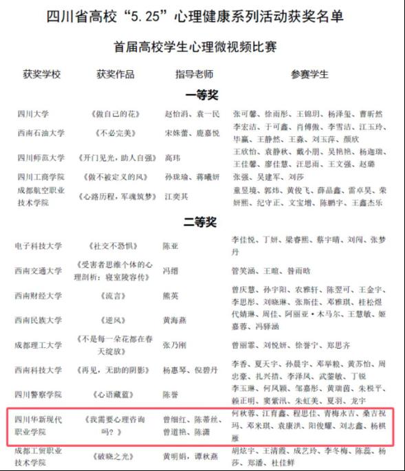 近日,在四川省心理学会高校心理健康教育专业委员会主办的2024年全省高校“5.25”心理健康系列活动中,我院学生团队在心理健康教育中心老师的指导和宣传部的支持下,凭借出色的表现,在高校学生心理微视频比赛中荣获二等奖,充分展示了我院在心理健康教育方面取得的优良成效和学生积极向上的精神风貌。