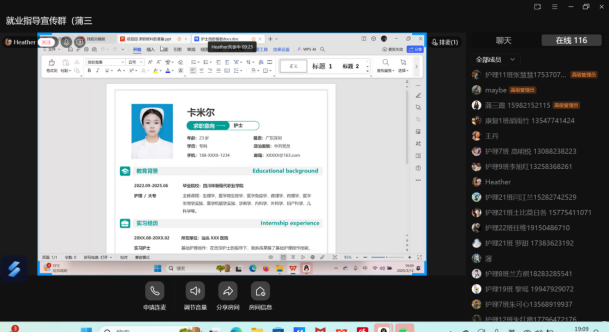 会议第一项,由医护康养学院辅导员邓靓老师主讲《如何设计制作一份优质简历》。她结合康复与护理专业的特点,详细讲解了简历撰写的技巧。邓老师从简历的结构、专业技能的展示、实习经历的描述等方面进行了深入剖析,并特别强调了如何突出康复与护理专业的实践能力和职业素养。她的讲解生动具体,为学生们提供了实用的指导。