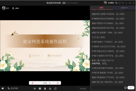 会议第二项,由医护康养学院辅导员牟兰老师主讲《就业协议签订及系统上传攻略》。牟兰老师为大家详细介绍了就业网签的操作流程,通过屏幕共享,逐步演示了网签系统的使用方法,并结合康复与护理专业的就业特点,解答了学生们在签约过程中可能遇到的常见问题。她的讲解清晰明了,帮助学生们掌握了网签的关键步骤,为顺利签约奠定了坚实基础。