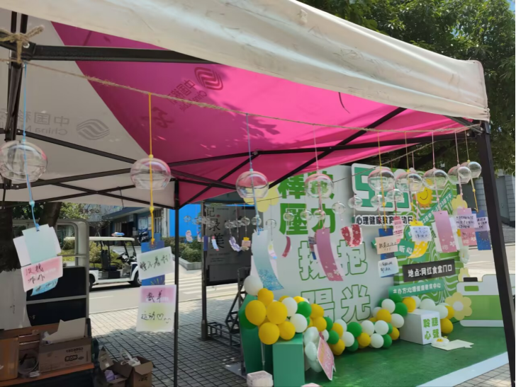 5月22日中午至5月23日下午,由心理健康教育中心主办,校学生会承办的“聆听心声 释放压力 拥抱阳光——5.25大学生心理健康教育活动”在校园网红食堂门口成功举行。活动包含两个游戏环节:“解忧风铃”和“情绪投掷站”以及一个拍照打卡点,吸引了众多师生积极参与。