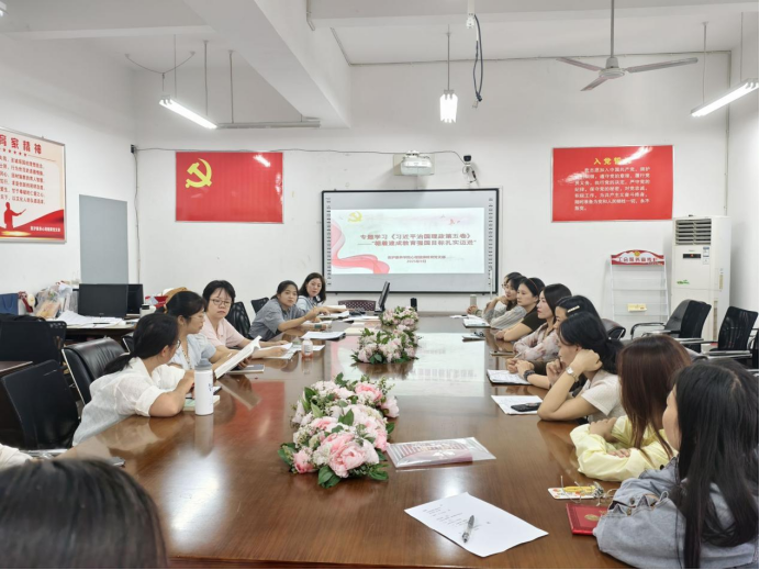 党支部副书记邓敏带领全体教职工专题学习《习近平谈治国理政第五卷》。她结合学院实际,提出三点实践路径:一是优化人才培养方案;二是深化产教融合;三是强化师资队伍建设,培养“双师型”教师团队。