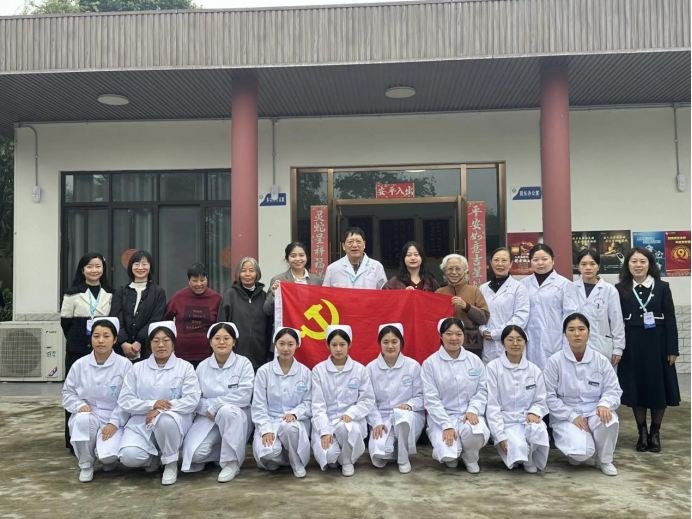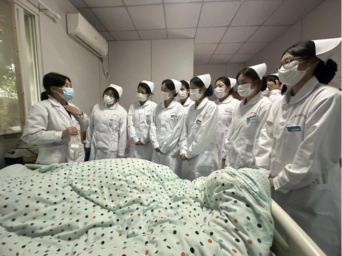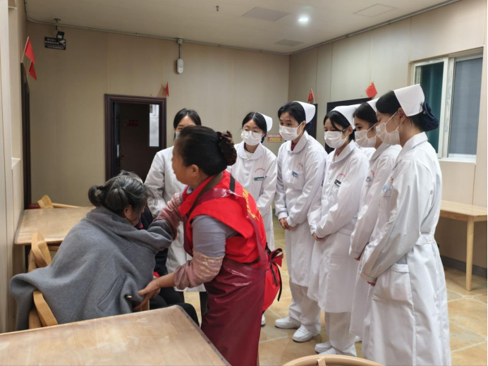 与此同时,支部书记杨敏、党员牟兰、钟琭葭、李明珠、李爽、蒲三霞、教师李婷婷带领的学生组的现场教学环节成为产教融合的核心亮点。学院分别在成都市第六人民医院、蓉东福寿养老院开展了现场教学活动。在专业教师与养老院护士组成的 “双师” 团队带领下,学生们深入养老院每一间房间、每一个工作岗位,沉浸式学习老年护理实操技能。从日常起居照料、康复辅助训练到应急情况处理,“双师” 团队结合岗位实际需求手把手指导,将课堂理论与行业实践精准对接。李婷婷老师更是以真实病例为教材,开展现场教学讲授,让学生在服务老人的过程中深化专业认知,实现 “学中做、做中学” 的职业教育培养目标。