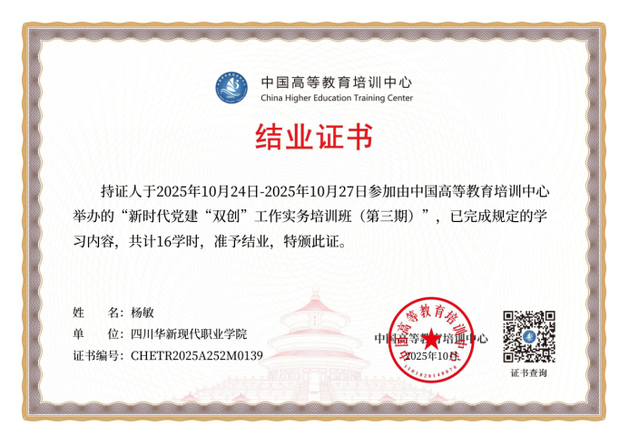 10月25—26日,中国高等教育学会指导、中国高等教育培训中心主办、北京中创研技术培训中心承办的2025年“新时代高校党建‘双创’工作实务培训班(第三期)”在西安举行。我院医护康养心理健康党支部书记杨敏与来自全国高校的校领导、组工干部等近200人同堂学习。