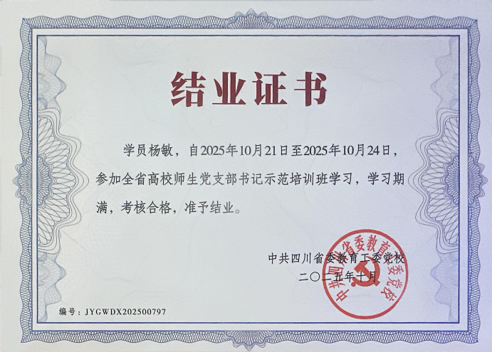 20251021日至24日,由四川省委教育工委在省委党校举办“全省高校师生党支部书记示范培训班”,医护康养学院党支部书记杨敏全程参训。