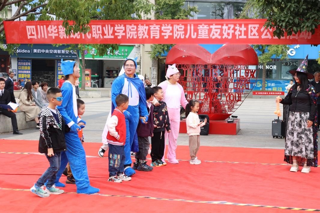 2024年11月3日下午,四川华新现代职业学院教育学院党支部组织教育学院童心剧社、舞蹈社、合唱团在西河客家广场成功举办了一场别开生面的旨在促进儿童友好社区建设的志愿服务活动。