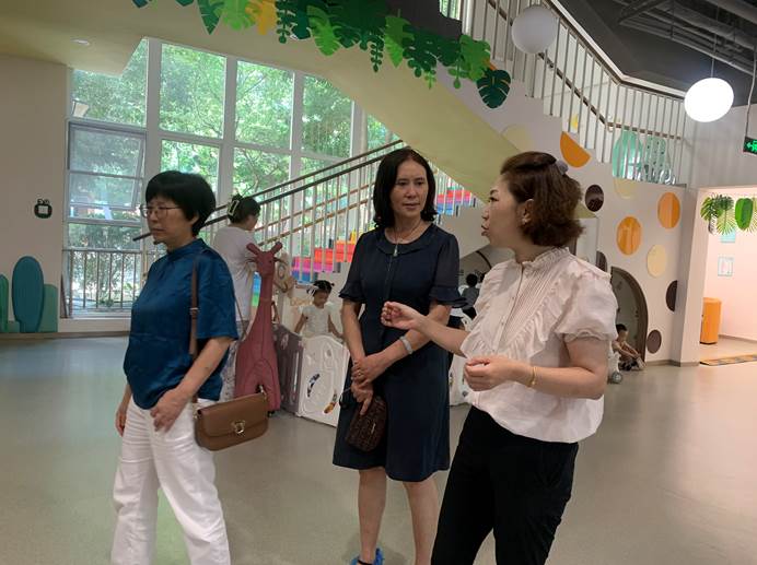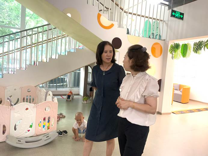 在园长的陪同下,何红一行参观了托育园,对园区的一日流程环节、场所设施及环境、婴幼儿课程开展、办学特色、以及教职工等情况进行了全面的了解。