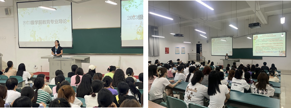 为了让学院新生能更好地适应大学生身份,更快地熟悉接下来的学习生活,教育学院于9月2号18:00分别于明德楼101和明德楼214举行了新生入学教育。学院全体教师到场与学生亲切交流,辅导员老师和专业负责人分别对校园生活、行为规范、专业发展、课程设置等方面进行了介绍。同时,学院还邀请到了幼教行业专家李琼副教授来校作专业认知讲座,激励新生们成长为可堪幼教大任的优秀人才。优秀实习生张静怡、王祥玉也来到了师弟师妹身边,以亲身经历,帮助新生了解“市场”和“职场”对大新生的要求,引导新生尽早树立远大理想,科学规划大新生活。