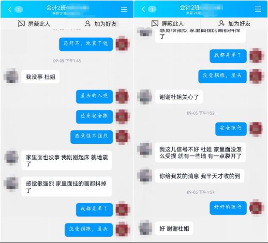 在电话中,我们还了解到两位同学在地震发生后的第一时间都迅速赶回了家中。有国才有家,除心系小家外,有1名同学还积极参与到当地的灾后救援与物资发放工作中,这一举动充分体现了经管学子的大爱精神,也展现了当代青年的时代担当。受到资助的两名同学对学院各位老师给予他们的关怀与惦念表达了感激之情,特别是感谢学院在精神上的鼓励和经济上的资助,并表示一定努力勤奋学习,不辜负国家、社会及学院的期望。