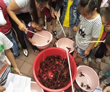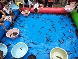 9点我们便开始了我们的活动,有许多的小朋友热情的参加活动。我们的游戏环节有6个,1有捉泥鳅、2数豆子、3无敌风火轮、4仓鼠运蔬菜、5钓龙虾、6贴熊猫。其中最热门的游戏是钓龙虾从一开始就有许多的小朋友踊跃参加,小朋友们都耐心的排着队,等到要到自己的时候。