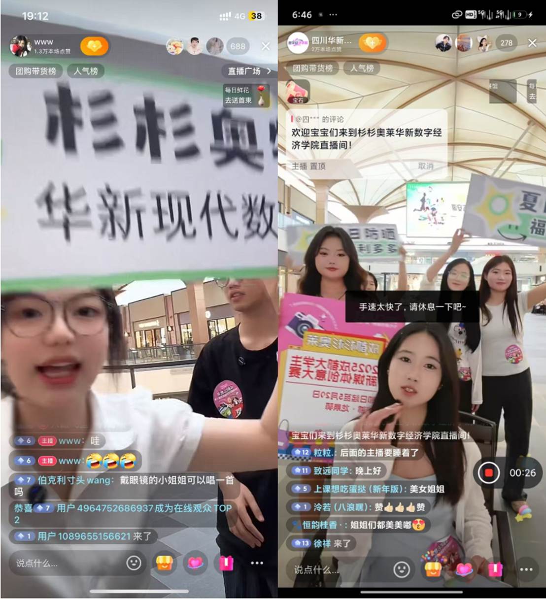 2025年5月14日,数字经济学院电子商务专业群师生团队联动杉杉奥特莱斯,成功开展“赋能杉杉奥特莱斯高校直播”活动。本次活动由龙泉驿区商务局主办,六个主题直播间同步开播,学子们手持云台穿梭于耐克、斯凯奇等品牌卖场,实现学院抖音主账号实时在线人数首次突破1000人。这一亮眼成绩,不仅是学院产教融合成果的生动展示,更是新双高建设背景下专业群对接区域消费升级战略的关键实践,也是“强国行”专项团队服务地方经济、践行使命担当的有力体现。
