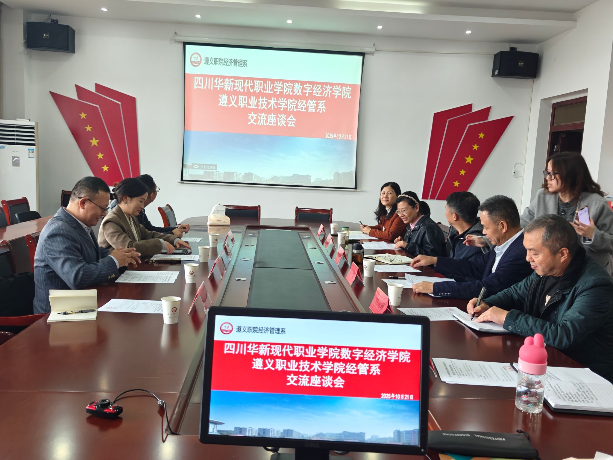 为全面推进高水平专业群建设,切实提升专业内涵质量,10月21日,华新职院副院长翁艳带队,数字经济学院院长肖红波教授及相关教师组成代表团,赴遵义职业技术学院开展交流座谈。双方围绕“强国行”专项团队建设、数字经济学院教学成果“川货出川”及课程思政示范基地建设等核心议题,通过实地观摩与座谈研讨,共探新时代数字商贸领域高素质技术技能人才培养的创新路径。遵义职业技术学院副院长温龙岚、经济管理系党支部书记王斌及系主任杨利民等热情接待了代表团。