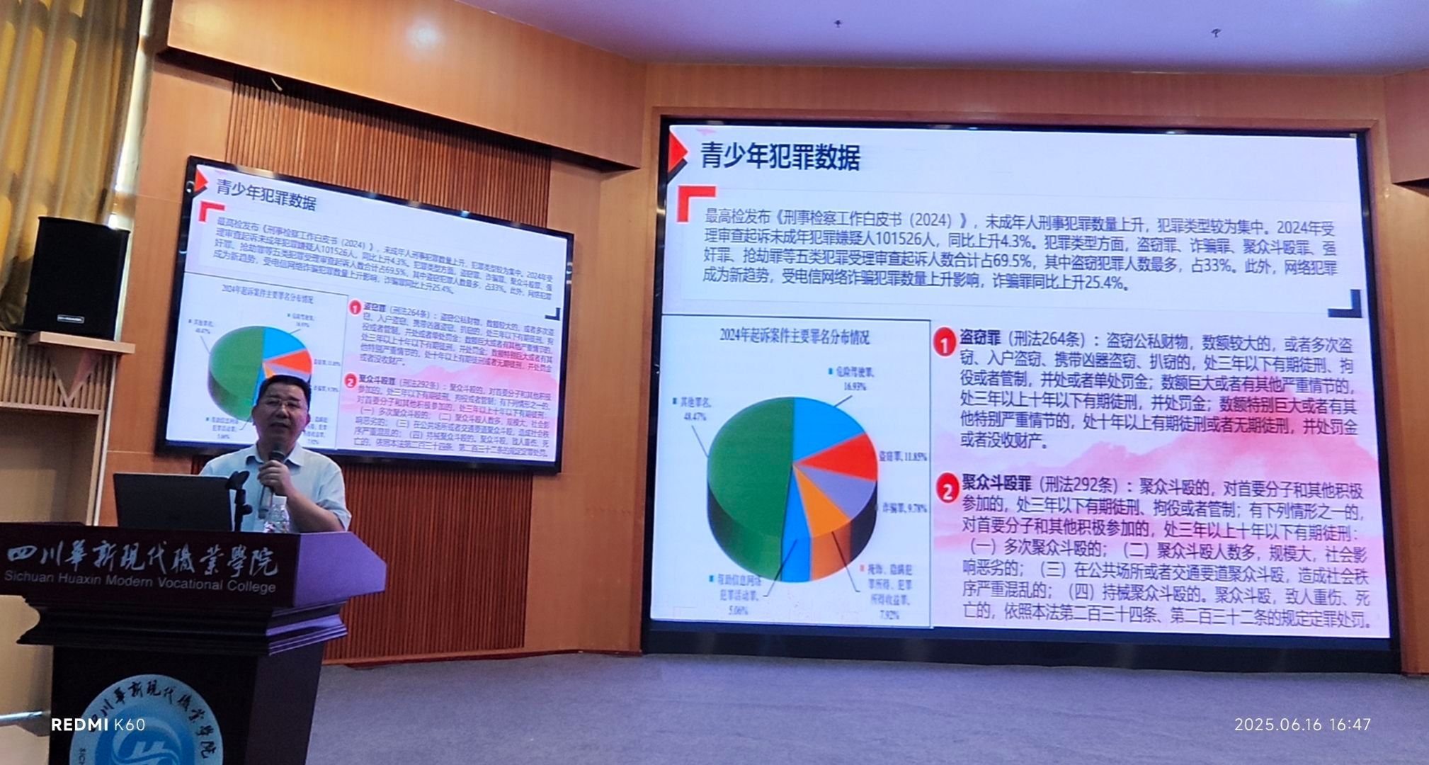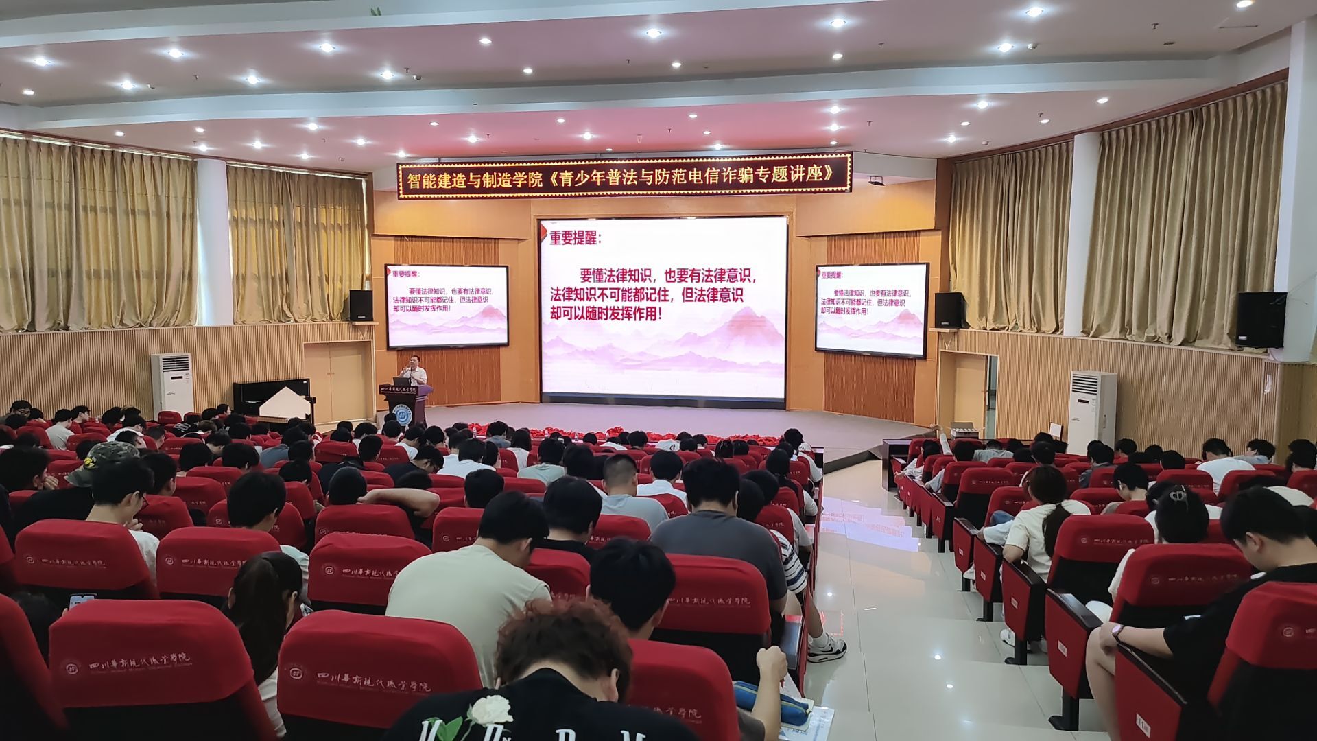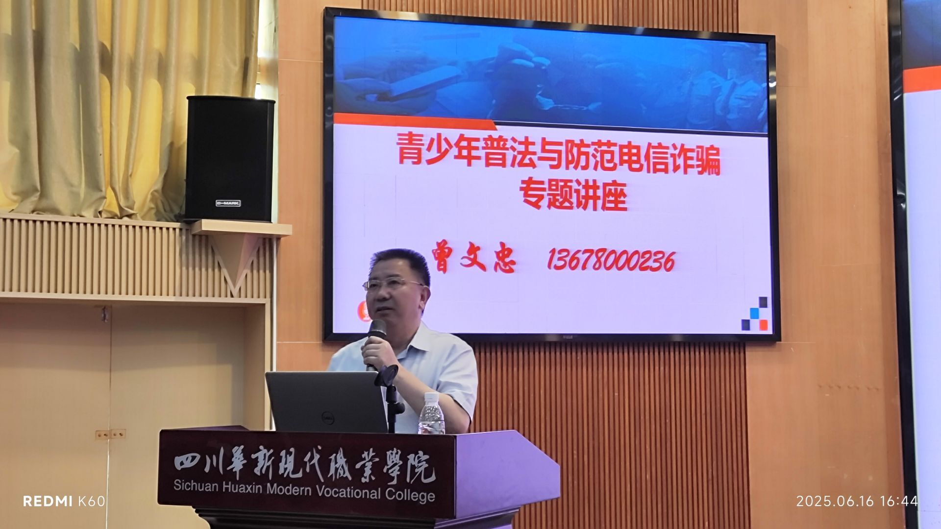 2025年6月16日,智能建造与制造学院开展了一场以“青少年普法与防范电信诈骗”为主题的专题讲座,本次讲座由四川瀛领禾石律师事务所管委会主任、四川省人大常委会委员曾文忠主讲。曾文忠主任不仅是四川省人大民宗委委员,还是最高人民检察院案件咨询专家、司法部法律援助案件评估专家,拥有丰富的法律实务经验和深厚的法学理论功底。